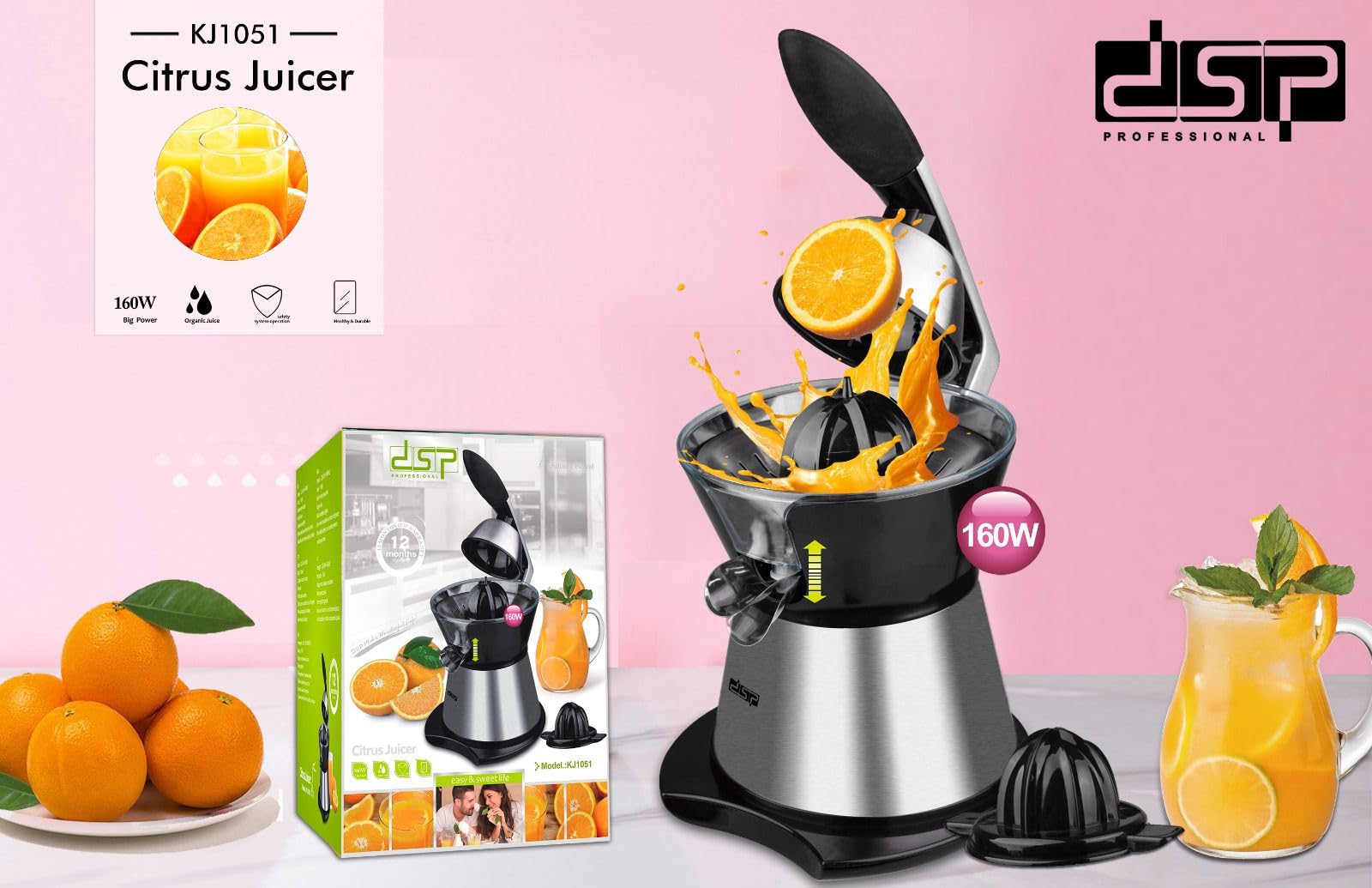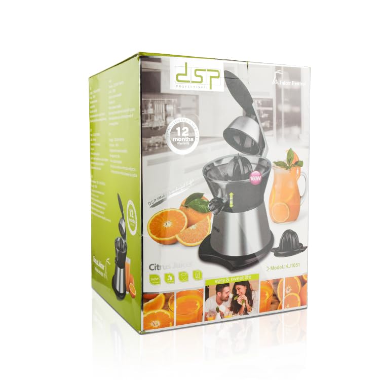 DSP KJ1051 Electric Citrus Juicer with Quiet Motor Orange Squeezer Stainless Steel Lemon Lime Grapefruit Cold Press, Anti-Drip Spout, BPA-Free, Organically Squeezed,16W