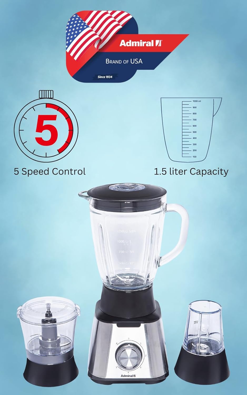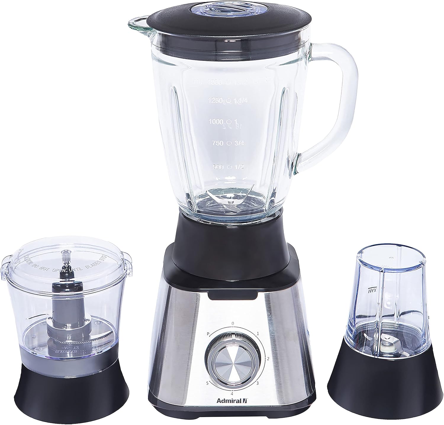 Admiral 1.5 Litre Blender with Grinder and Chopper, 600W Power, 2 Grinding Mills, Stainless Steel Blades, 5 Speed with Pulse Control, Anti-Slip Feet, ADBL1560, 1 Year Warranty.